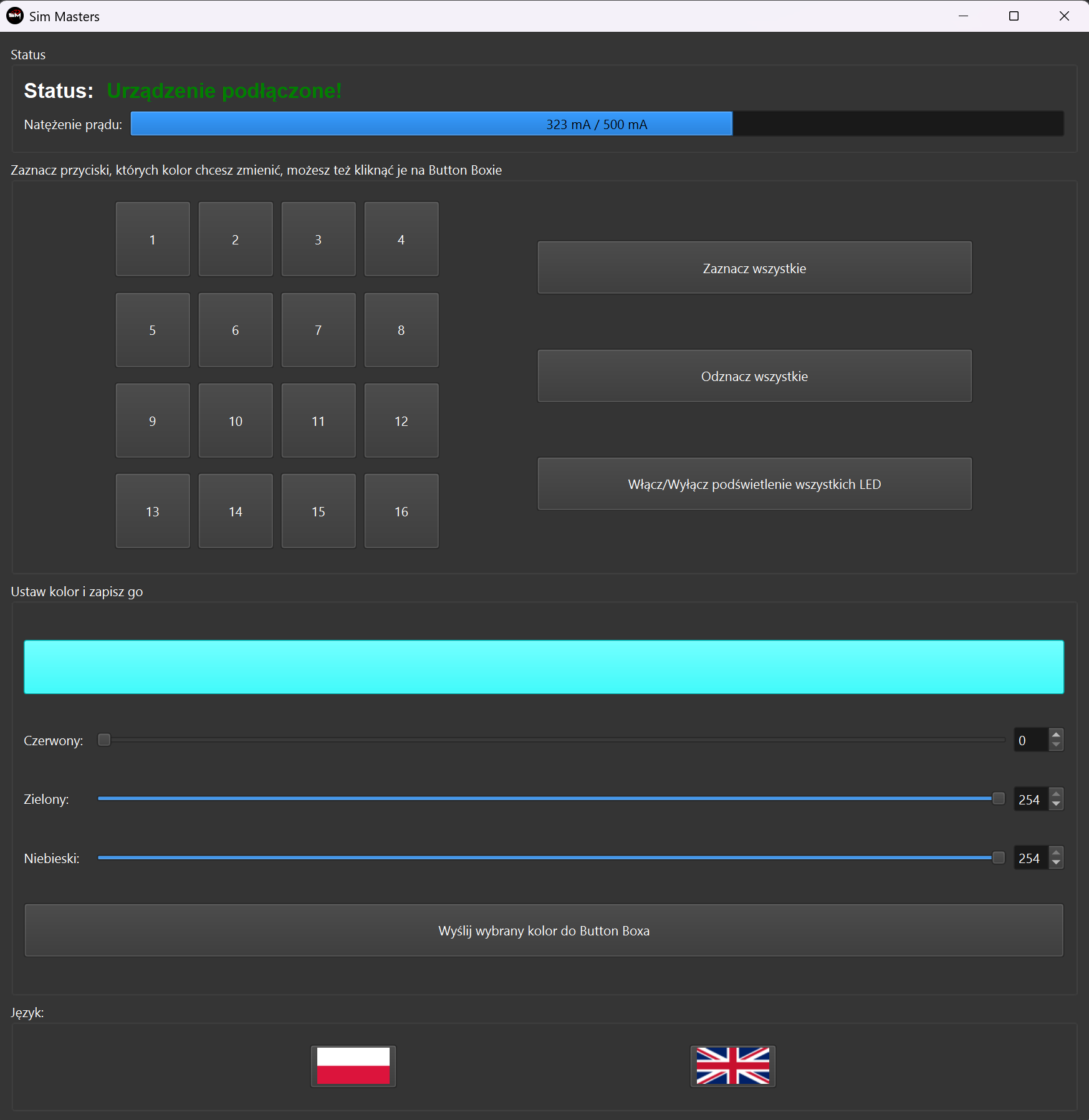 Po odłączeniu od USB, button box zapamięta ustawienie kolorów i po ponownym podłączeniu,